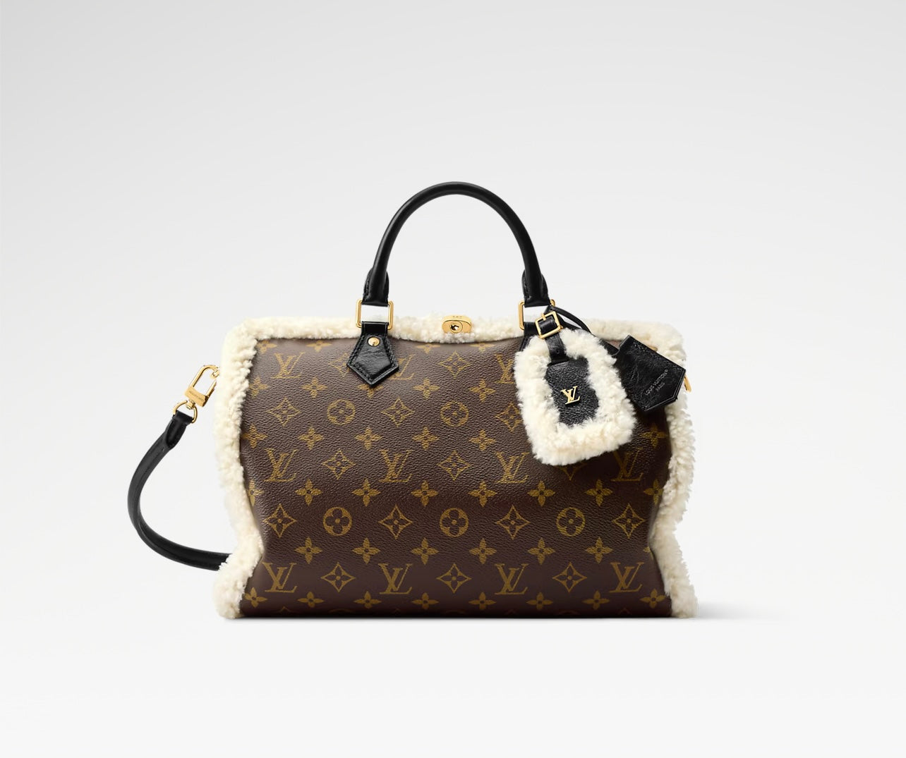 LV Speedy Bandouliere 30 Teddy handbag. It features the classic LV monogram with a cozy shearling trim. Perfect for adding a touch of luxury to your wardrobe!